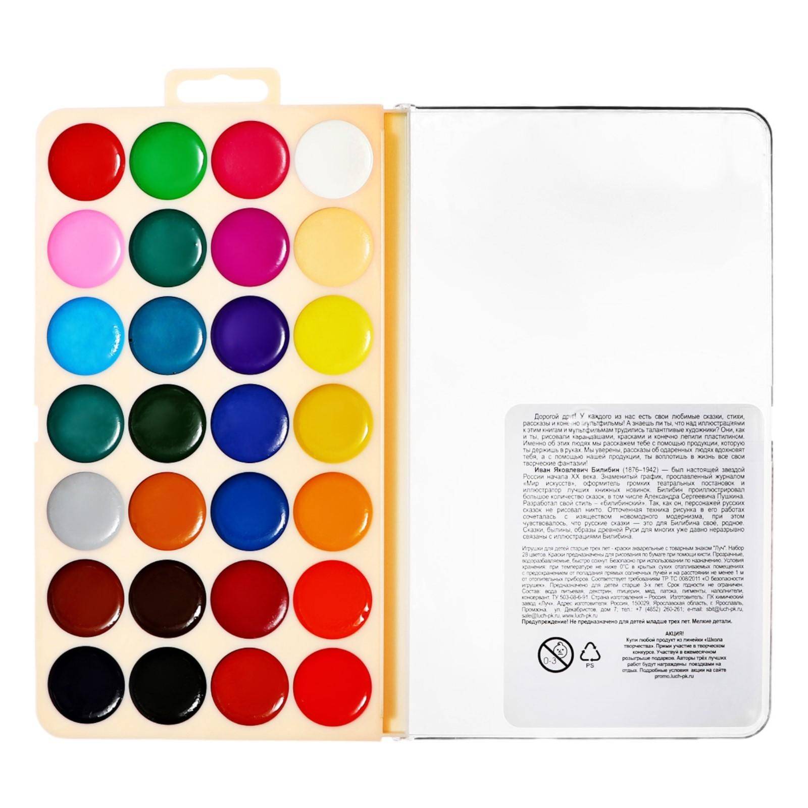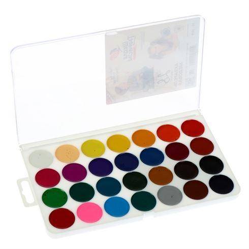 Set de vopsele acuarele Scola tvorcestva, 28 de culori de inalta calitate pentru creativitatea copiilor, realizata dupa reteta clasica. O caracteristica distinctiva a liniei este aranjarea convenabila a culorilor vopselei in grupuri: nuante reci-calde, care le permite copiilor sa dezvolte perceptia si armonia culorilor. Acuarela contine miere, ceea ce ii imbunatateste semnificativ calitatea si aspectul. Baza transparenta la aplicare, fara incluziuni. Vopselele sunt ambalate intr-o cutie de plastic cu capac transparent, in cuve rotunde clasice. Setul contine 28 de culori: alb, bej, lamaie, galben, galben inchis, portocaliu, rosu, roz, liliac, violet, albastru, albastru deschis, visiniu, ocru rosu, verde deschis, verde smarald, turcoaz, verde, ocru, cafeniu, negru, carmin, roz aprins, albastru azuriu, albastru-verde, gri, cafeniu oxid de fier, ultramarin.