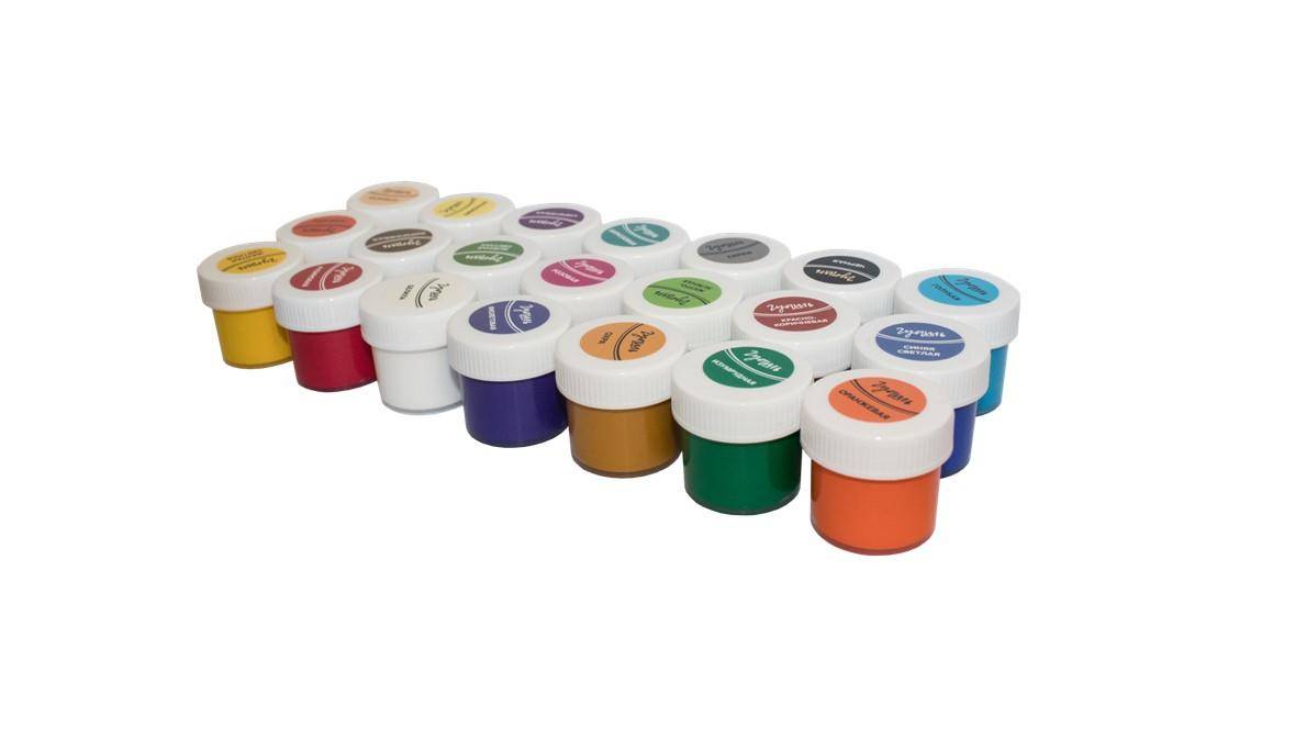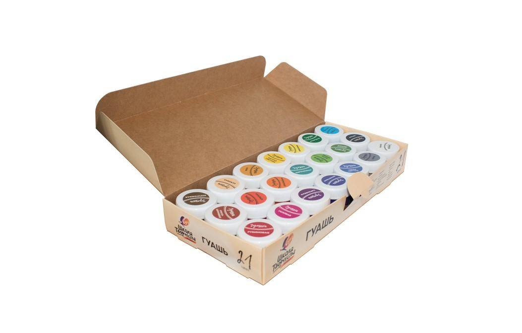 Goasa Luci, Scola tvorcestva, 21 borcane de plastic, cate 20 ml; 21 culori: alb titan, galben deschis, rosu, smarald, albastru deschis, negru, portocaliu, liliac, albastru, galben-verde, rosu-maro, bej, gri, verde deschis, roz, turcoaz, violet, ocru, lamaie, maro, rubin. �onsistenta si uniformitate optima (vopseaua nu este lichida, nu este ingrosata, nu este uscata ). Este foarte convenabil sa pictezi cu ea: se spala usor cu apa si se aplica bine pe hartie, carton, panza, tesatura si placaj. O eticheta stralucitoare pe capac care indica culoarea vopselei este o comoditate pentru utilizator. Ambalajul sigilat previne uscarea vopselei. Vopseaua se caracterizeaza prin culori stralucitoare, frumoase si pure. Se amesteca bine, permitandu-va sa obtineti noi culori si nuante pure. Guasa are o putere excelenta de ascundere. Cand este uscata, vopseaua nu se estompeaza si capata o suprafata catifelata. Nu are un miros neplacut.