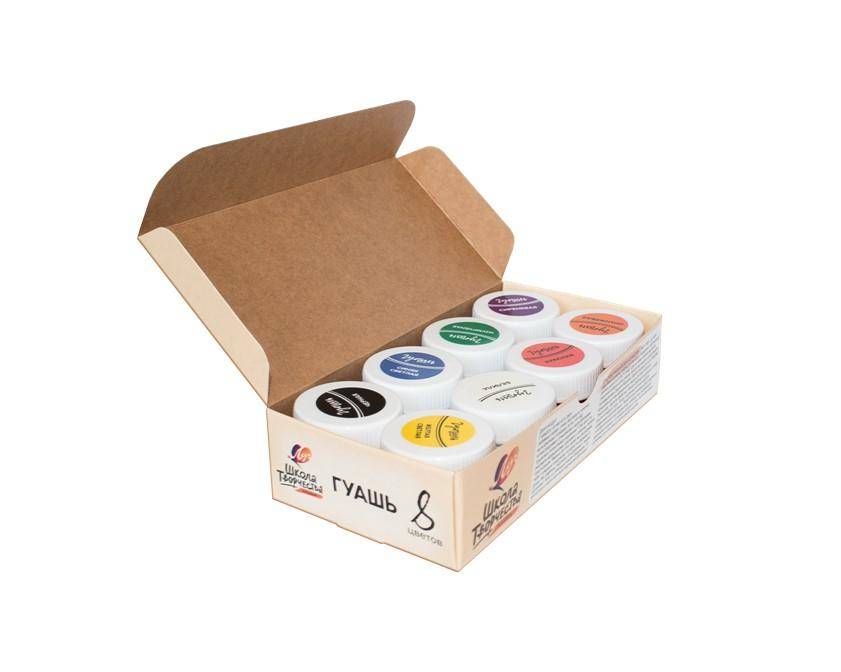 Goasa Luci, Scala tvorcestva, 8 borcane de plastic, cate 20 ml; 8 culori: alb titan, galben deschis, rosu, smarald, albastru deschis, negru, portocaliu, liliac. Consistenta si uniformitate optima (vopseaua nu este lichida, nu este ingrosata, nu este uscata ). Este foarte convenabil sa pictezi cu ea: se spala usor cu apa si se aplica bine pe hartie, carton, panza, tesatura si placaj. O eticheta stralucitoare pe capac care indica culoarea vopselei este o comoditate pentru utilizator. Ambalajul sigilat previne uscarea vopselei. Vopseaua se caracterizeaza prin culori stralucitoare, frumoase si pure. Se amesteca bine, permitandu-va sa obtineti noi culori si nuante pure. Guasa are o putere excelenta de ascundere. Cand este uscata, vopseaua nu se estompeaza si capata o suprafata catifelata. Nu are un miros neplacut.
