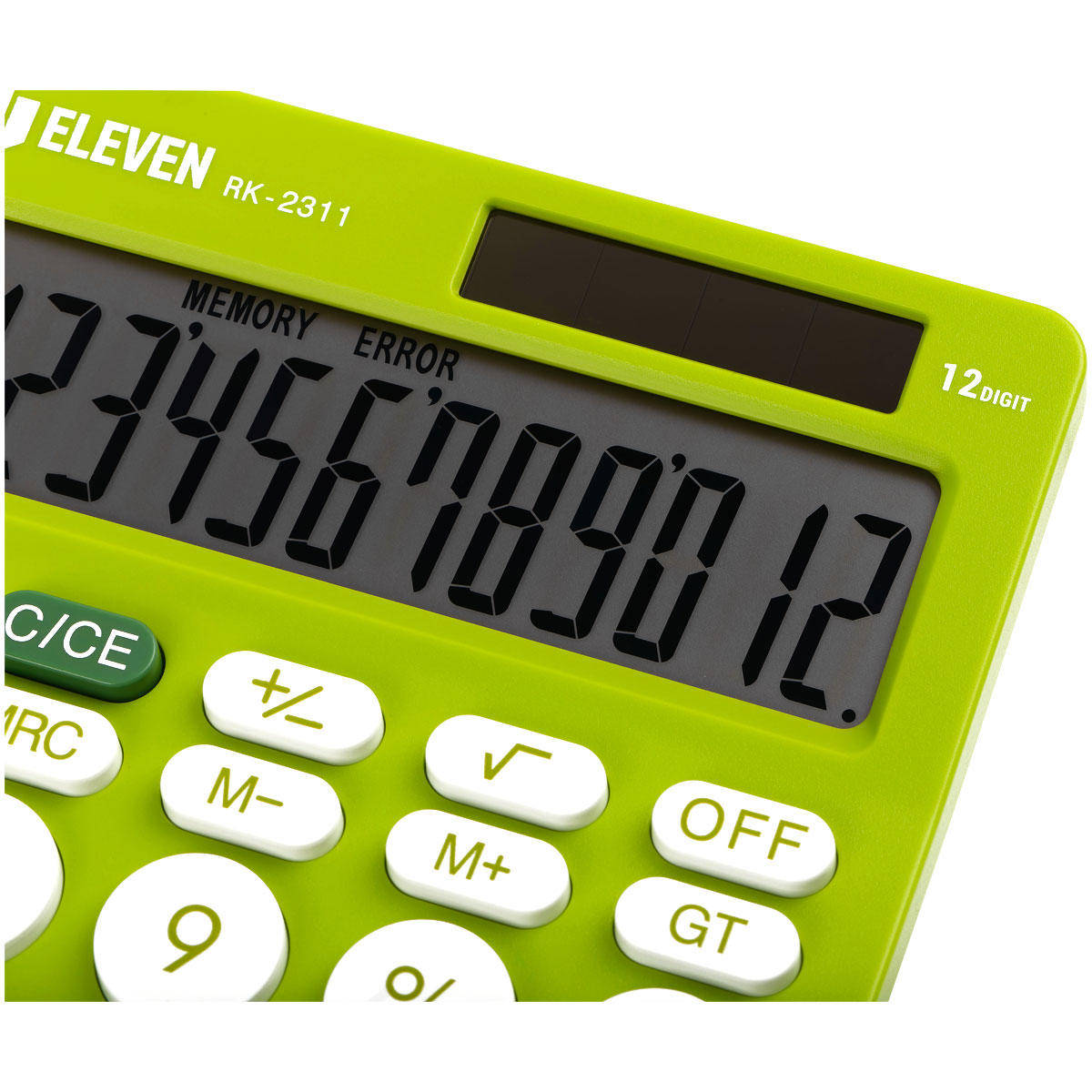 Calculator cu 12 cifre Eleven RK2311GN este un asistent indispensabil la birou, la scoala si acasa. Un set optim de functii va ajuta la automatizarea calculelor: calcul radacina patrata, corectare a ultimei valori introduse, buton �00� si �000�, memorie dubla, calcul de adaos. Alimentare dubla (solar + baterie AG10, LR1130, LR54) si oprirea automata. Dimensiunea calculatorului 195x145x26 mm. Culoare verde, butoane rotunde.