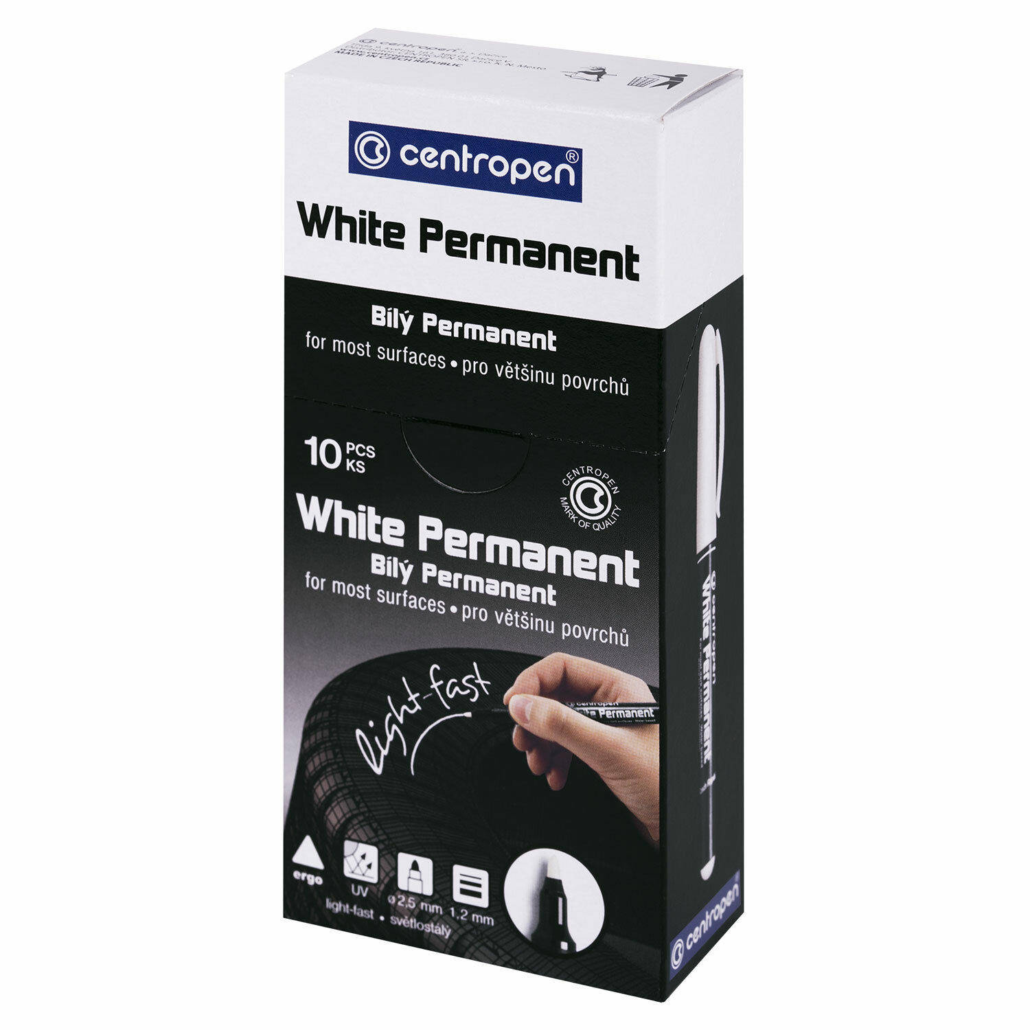 Marker permanent, alb. Destinat pentru scris pe majoritatea suprafetelor. Cerneala pe baza de apa, rezistenta la lumina. Dupa uscare, este rezistent la apa, abraziune si intemperii. Varf rotund, grosime linie 1,2 mm. Diametru corp 10 mm. Cantitate in cutie: 10 bucati.