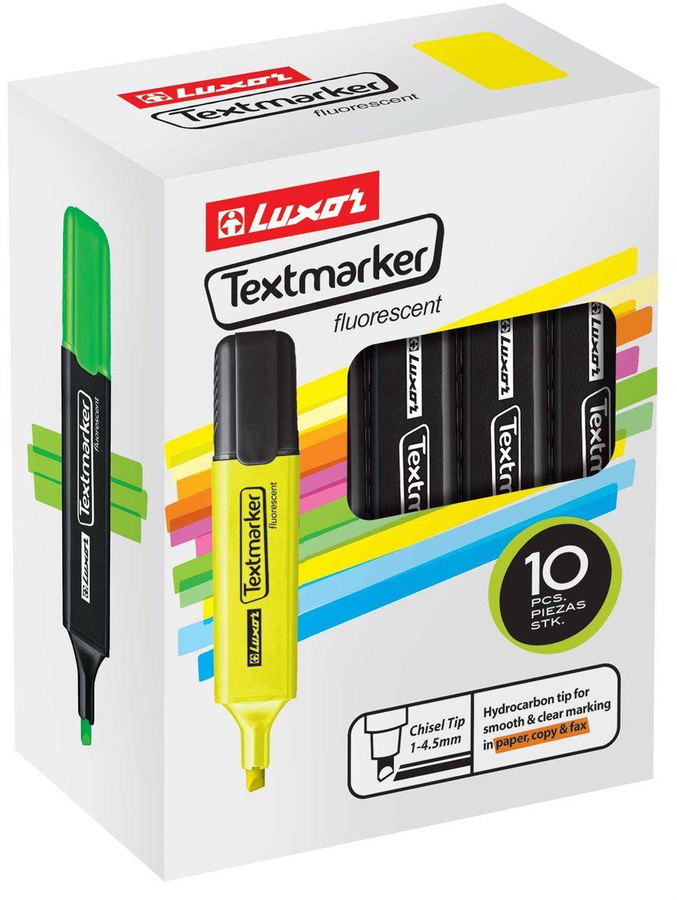Marker text fluorescent LUXOR, de culoare portocaliu, pe baza de apa. Grosimea liniei de scris 1-4,5 mm, varf tesit. Capac cu clema.Markerul este ideal pentru toate tipurile de hartie. Cantitate in cutie: 10 bucati.