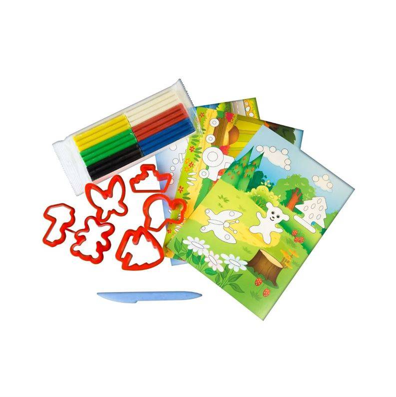 Set de modelare din plastilina. Pe deal este destinat crearii unei imagini tridimensionale pe o suprafata (o carte de colorat cu elemente nevopsite) folosind tehnica aplicatiei. Piesele multicolore vor fi figurine pre-decupate folosind matrite duble - nisip din plastilina moale de ceara. Continutul setului: plastilina moale 6 culori 3 desene color 6 forme cutit din plastic