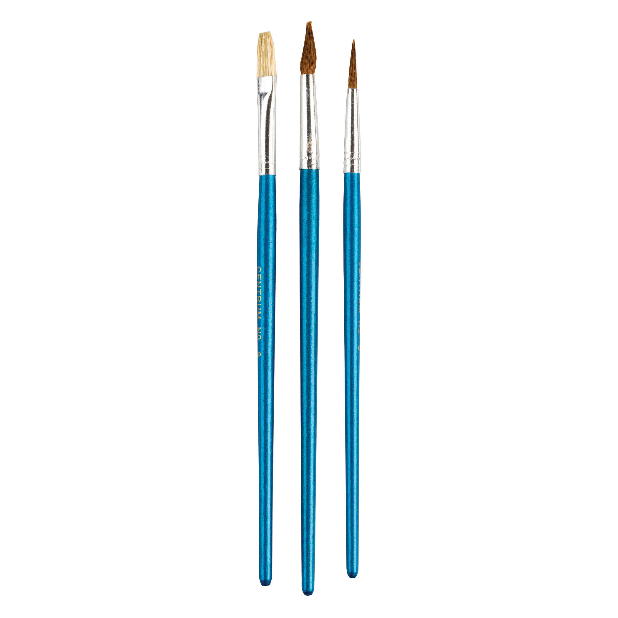 Setul de pensule pentru arta Centrum este fabricat din par de oaie. Pensulele absorb, tin si elibereaza bine vopseaua. Produsele sunt potrivite pentru lucrul cu acuarele, guasa, tempera si materiale hidro-polimer. Forma pensulei este rotunda pentru Nr. 6,8 si plata pentru Nr 6. Materialul manerului este din plastic. Culoare maner pensula albastru. Setul contine 3 piese: Nr.6,8,6. Produsul este ambalat intr-un blister cu umeras Euro.