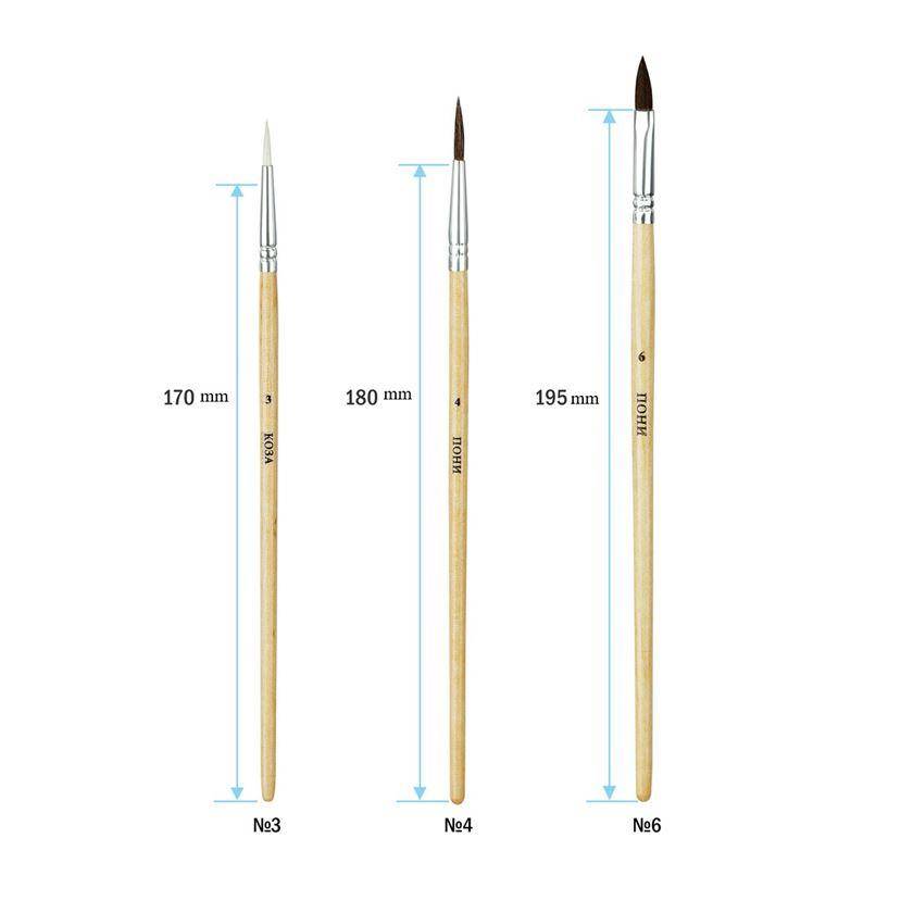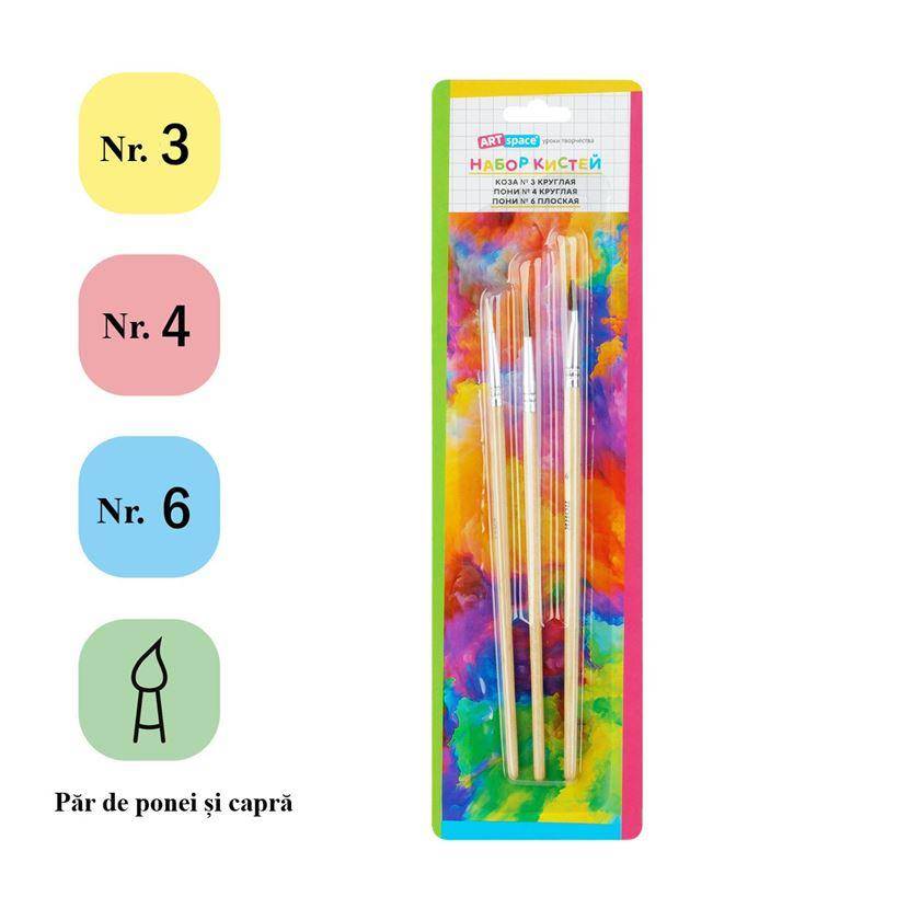 Set de pensule ArtSpace din par de ponei si capra. Potrivit pentru lectii de desen pentru incepatori. Setul contine 3 pensule de diferite marimi. Sunt ideale pentru a crea capodopere vibrante si pentru a testa noi tehnici artistice. Setul contine 3 pensule cu diferite tipuri de par si varfuri: Capra - rotund nr. 3, ponei - rotund nr. 4, ponei - plat nr. 6. Ambalaj blister cu pandantiv Euro