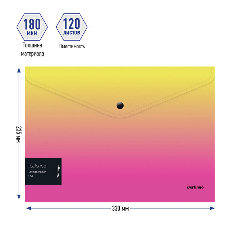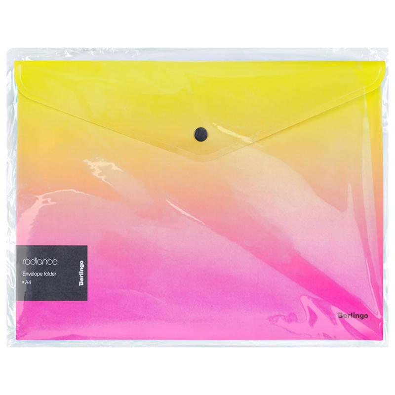 Mapa-plic din seria Berlingo Radiance in format A4 cu buton va deveni un accesoriu elegant pentru munca si studiu. Mapa, cu dimensiunile 330*235 mm, este fabricat din polipropilena de calitate superioara cu gradient galben/roz si grosimea de 180 microni cu textura de suprafata de nisip mat, care nu prezinta amprente si mici zgarieturi. Conceput pentru depozitarea si transportul documentelor, prevenind s?ifonarea si murdaria acestora. Un autocolant individual pe fiecare mapa cu un cod de bare si informatii generale. Are o orientare verticala. Produsul ofera acces rapid la documente. Mapa se inchid cu un buton si poate contine pana la 120 de coli.