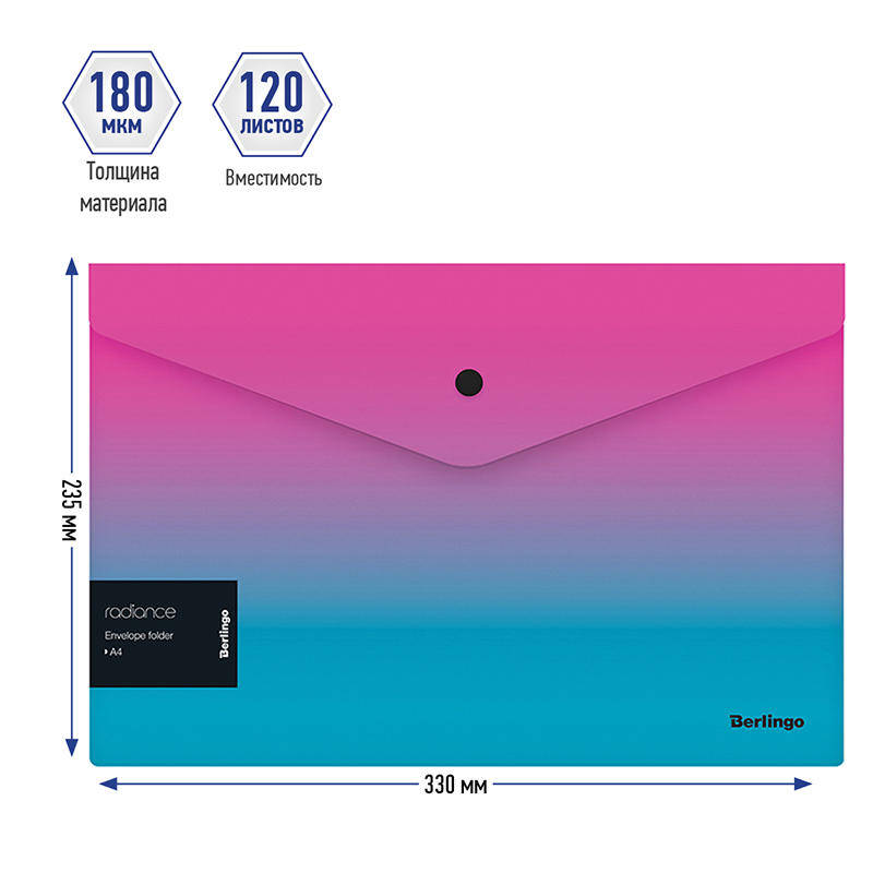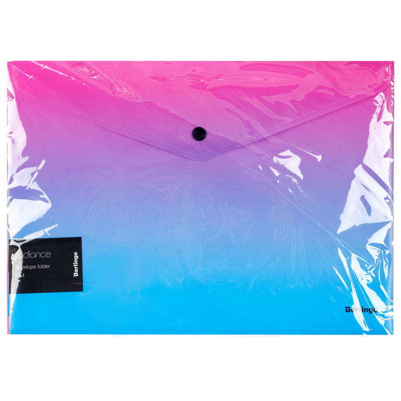 Mapa-plic din seria Berlingo Radiance in format A4 cu buton va deveni un accesoriu elegant pentru munca si studiu. Mapa, cu dimensiunile 330*235 mm, este fabricat din polipropilena de calitate superioara cu gradient albastru/roz si grosimea de 180 microni cu textura de suprafata de nisip mat, care nu prezinta amprente si mici zgarieturi. Conceput pentru depozitarea si transportul documentelor, prevenind s?ifonarea si murdaria acestora. Un autocolant individual pe fiecare mapa cu un cod de bare si informatii generale. Are o orientare verticala. Produsul ofera acces rapid la documente. Mapa se inchid cu un buton si poate contine pana la 120 de coli.