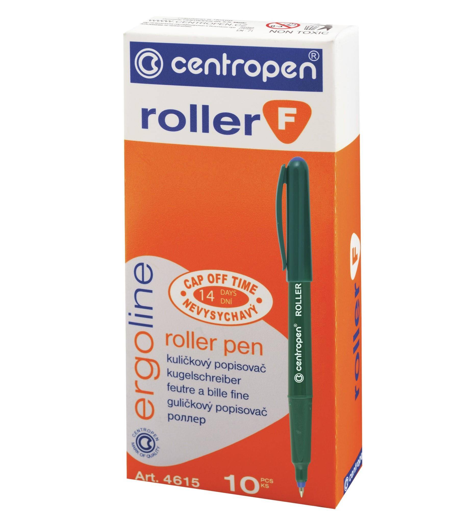 Pix-roller 4615F cu design ergonomic. Corpul este triunghiular, verde. Cerneala care nu se usuca (nu se usuca pana la 14 zile fara capac). Unitate de scris subtire din metal cu o bila din carbura de tungsten. Lungimea liniei continue 2.200 m. Diametrul liniei 0,3 mm. Culoare cerneala: albastru. Cantitate in ambalaj: 10 bucati.