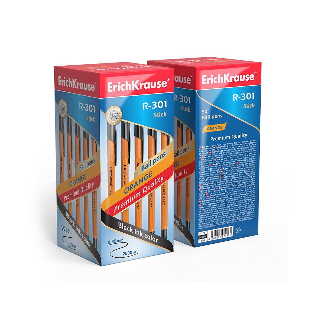 Pix cu bila clasic Stick cu o unitate de scris standard si incarcatura inlocuibila. Pixul are un corp hexagonal portocaliu opac, cu o zona de prindere confortabila profilata si un capac ventilat. Culoarea capacului si a dopului se potriveste cu culoarea cernelei, negru. Unitatea de scris cu 5 canale cu diametrul bilei de 0,7 mm, combinata cu cerneala cu uscare rapida, asigura o scriere moale si rapida. Lungimea liniei continue este de 2000 m cu o grosime de 0,35 mm, care este unul dintre cei mai buni indicatori din categoria sa. Modelul R-301 Orange 0.7 Stick are o forma patentata recunoscuta si a devenit unul dintre cele mai bine vandute din gama de pixuri cu bila ErichKrause in mai mult de cincizeci de tari din intreaga lume. Cantitate in cutie: 50 bucati.