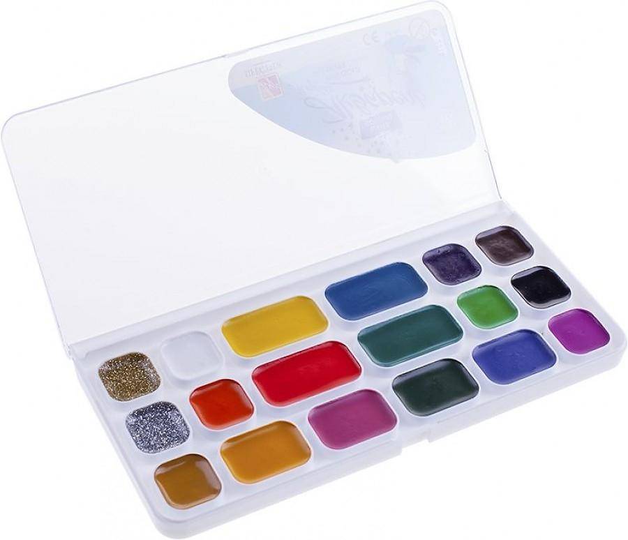 Помимо 16-ти базовых цветов, в набор добавлены две кюветы с золотыми и серебряными блестками для создания необычных эффектов в рисунках. Мы знаем, что цвета расходуются неравномерно, поэтому мы увеличили размер кюветы самых популярных оттенков (4 больших + 4 средних). Краска изготавливается по классической рецептуре, с добавлением меда, что значительно улучшает её качество и внешний вид. В наборе 18 цветов акварели: белила, желтая, алая, светло-зеленая, черная, оранжевая, голубая, изумрудно-зеленая, фиолетовая, коричневая, охра, желтая темная, розовая, зеленая, синяя, сиреневая, с золотыми блестками, с серебряными блестками.