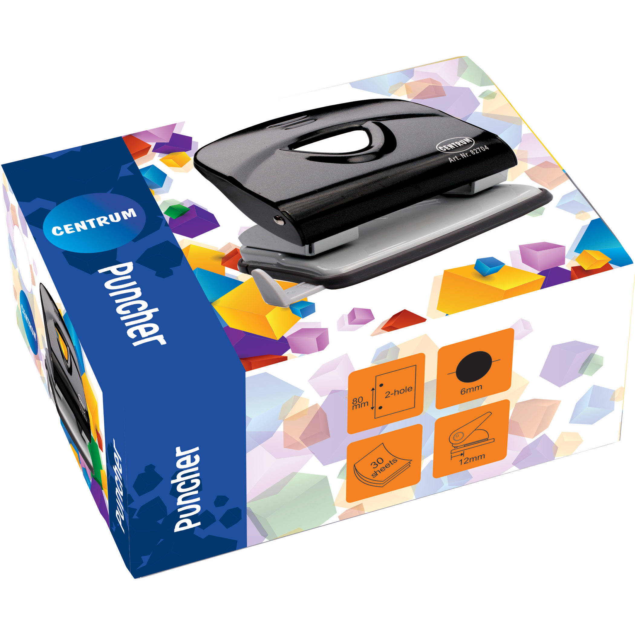 Дырокол Centrum с мощностью до 25 листов производится в металлическом корпусе. Он также снабжен ограничительной линейкой, а его поддон для конфетти легко очищать благодаря особой форме дна. Корпус черного цвета. Диаметр пробивного отверстия: 6,0 мм. Расстояние между пробивными отверстиями: 79 мм.
