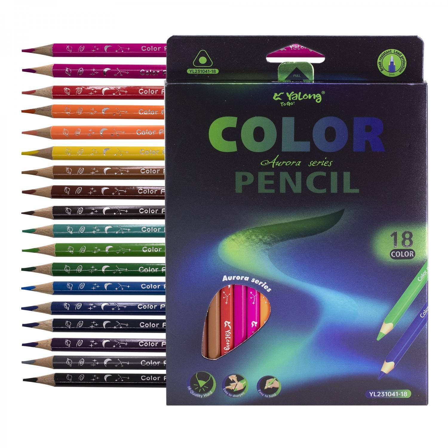Набор цветных карандашей Yalong на 18 цветов. Корпус трехранный, материал дерево. Упаковка: картонная коробка с европодвесом
