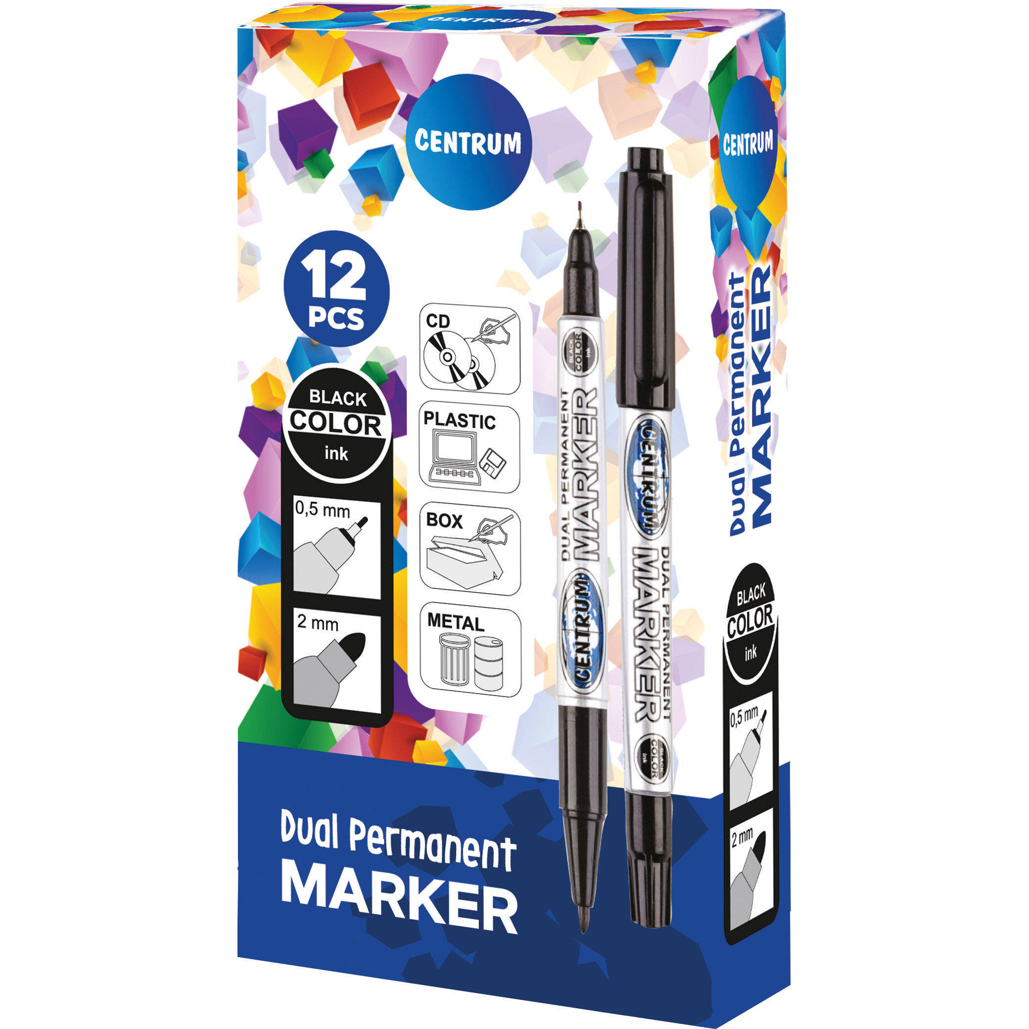 Универсальный и удобный перманентный маркер для записи на CD/DVD с двумя разными наконечниками Толщина линии 0,5 мм или 2 мм. Подходит для письма на металле, стекле и других поверхностях.Количество в упаковке 12 штук.