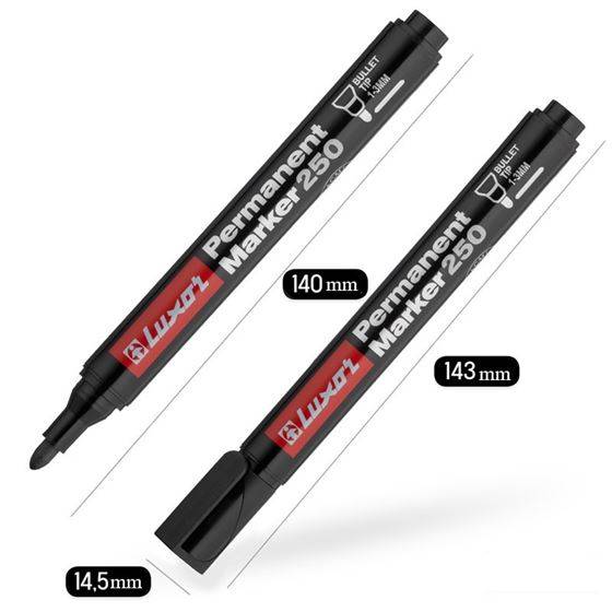 Перманентный маркер Luxor 250 - универсальное решение для маркировки на всех типах поверхностей: металл, дерево, резина, бетон, камень, кирпич, стекло, пленка, картон. Чернила несмываемого маркера устойчивы к климатическим изменениям: дождь, туман, солнце, не стираются и не выцветают в течение длительного времени, оставляют четкую и однородную линию, безопасны для использования и не содержат ксилол и толуол. Чернила на спиртовой основе. Корпус маркера изготовлен из прочного пластика. Форма корпуса круглая. Диаметр корпуса 14,5 мм. Цвет чернил - черный, диаметр пишущего узла от 1- 3 мм. Упаковка: картонная коробка по 12 штук.