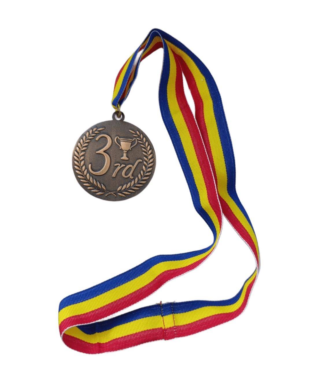 Элегантная металлическая медаль диаметром 6,5 см. Медаль имеет трехцветную ленту.