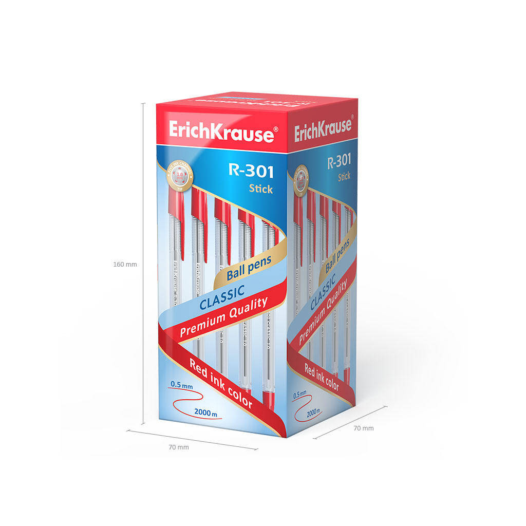 Классическая шариковая ручка Stick со стандартным типом пишущего узла и заменяемым стержнем. Ручка имеет прозрачный шестигранный корпус с удобной профилированной грип-зоной и вентилируемый колпачок. Цвет колпачка и заглушки соответствует цвету чернил. 5-канальный пишущий узел с диаметром шарика 1.0 мм в сочетании с быстросохнущими чернилами обеспечивает мягкое и комфортное письмо. Длина непрерывной линии составляет 2000 м при толщине 0.5 мм. Модель R-301 Classic 1.0 Stick имеет узнаваемую запатентованную форму и стала абсолютным бестселлером в ассортименте шариковых ручек ErichKrause более чем в пятидесяти странах мира. Количество в упаковке: 50 штук