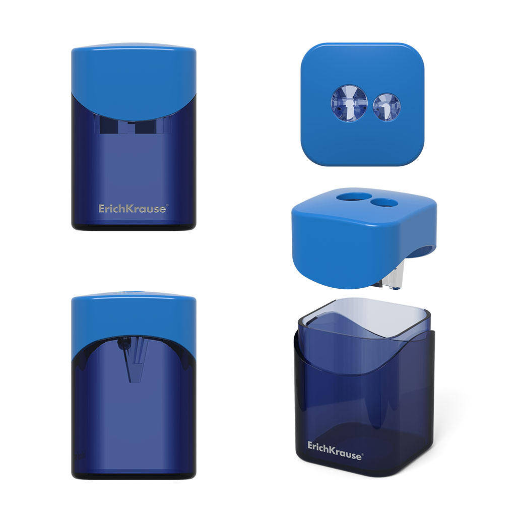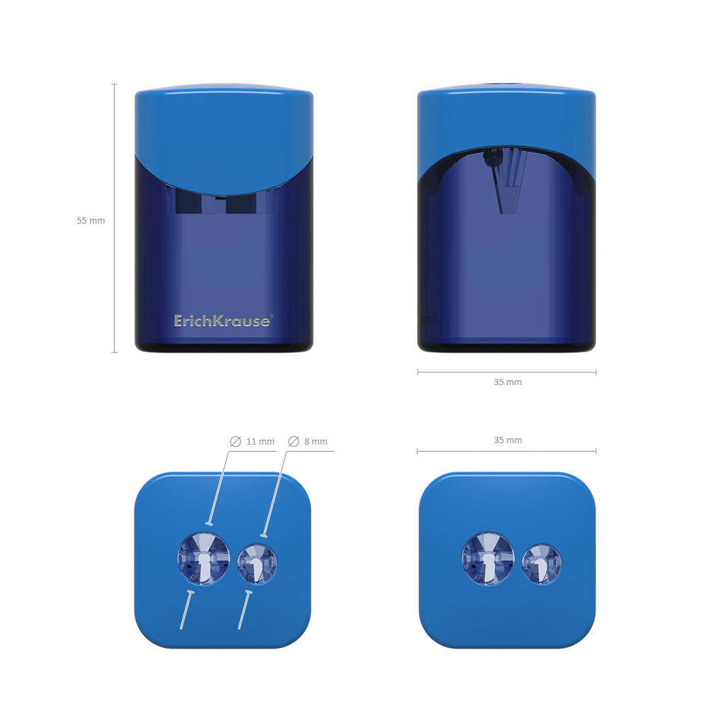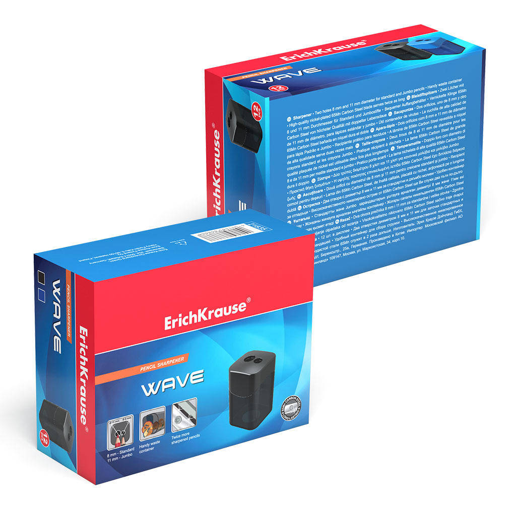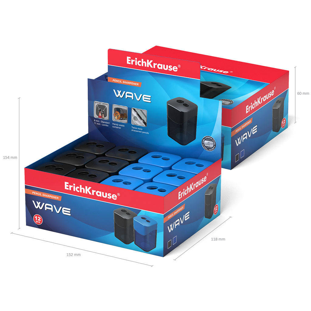 Точилка пластиковая ErichKrause Wave, Classic, пластиковая точилка с ёмким тонированным контейнером для сбора стружки. Имеет два отверстия диаметром 8 мм и 11 мм для заточки стандартных и утолщенных (Jumbo) карандашей. Высококачественное никелированное брендированное лезвие из углеродистой стали гарантирует высокую производительность. Цвет корпуса: синий, черный. Размер 38 х 57 х 38мм. Упаковка коробка-дисплей по 12 штук